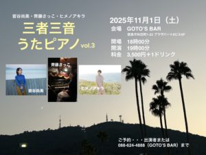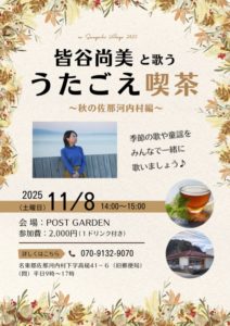 投稿日: 2026年1月18日2026年1月18日 投稿者: 皆谷尚美2025年コンサート・ライブ 2025年も、いろんな町で歌わせていただきました。お越しくださった皆様、ありがとうございました。2026年も、どうぞよろしくお願いします。